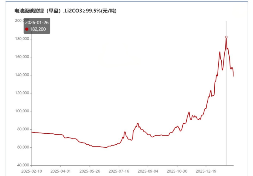 作为动力电池的核心原料,电池级碳酸锂的价格走势尤为惊人,从2025年初的每吨75,700元飙升至2026年1月26日的182,200元,涨幅超150%,尤其是2025年四季度以来涨势进一步加剧,23天内价格就实现了35%的上涨,即便后续有小幅回调,价格仍处于历史高位。