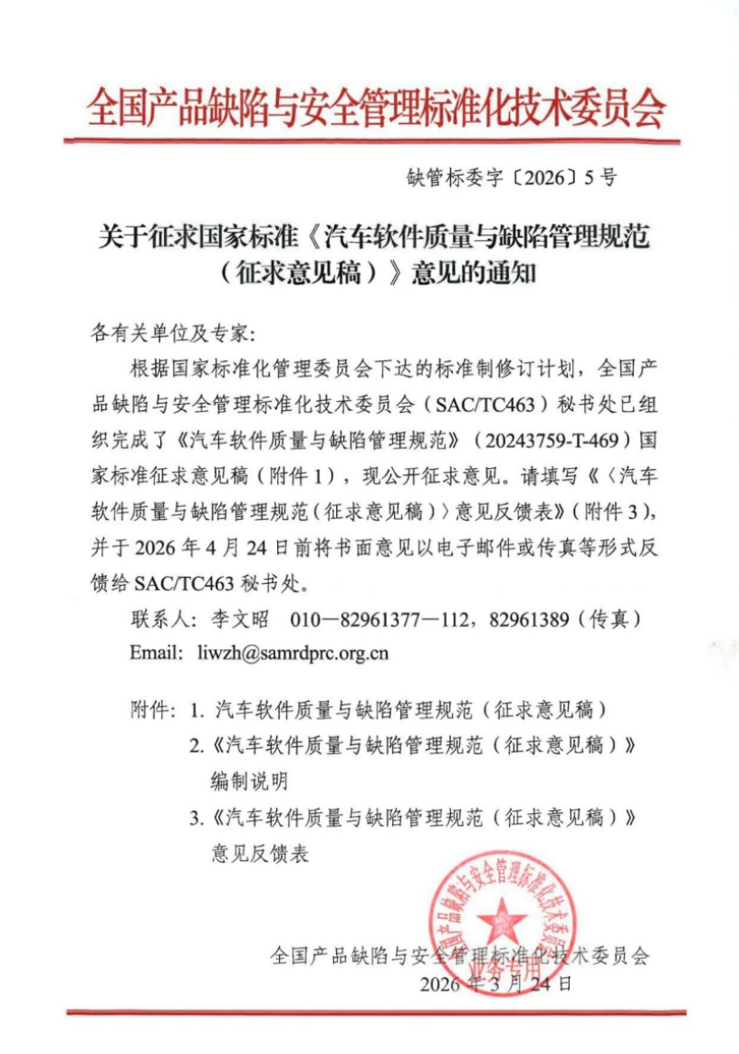 近日,国家市场监督管理总局缺陷产品召回技术中心联合专业协会、8家国内主流整车企业、7家汽车电子与科技领域领军企业、3家知名高校及科研院所,以及权威机动车检测认证机构,共同起草的《汽车软件质量与缺陷管理规范(征求意见稿)》(以下简称《征求意见稿》)开始面向社会正式征询。作为全球首个融合功能安全、预期功能安全、信息安全与人工智能安全的车规级标准,它不仅填补了国内空白,也以“风险前置”重构了汽车软件质量管理的逻辑——从“救火”全面转向“防火”。