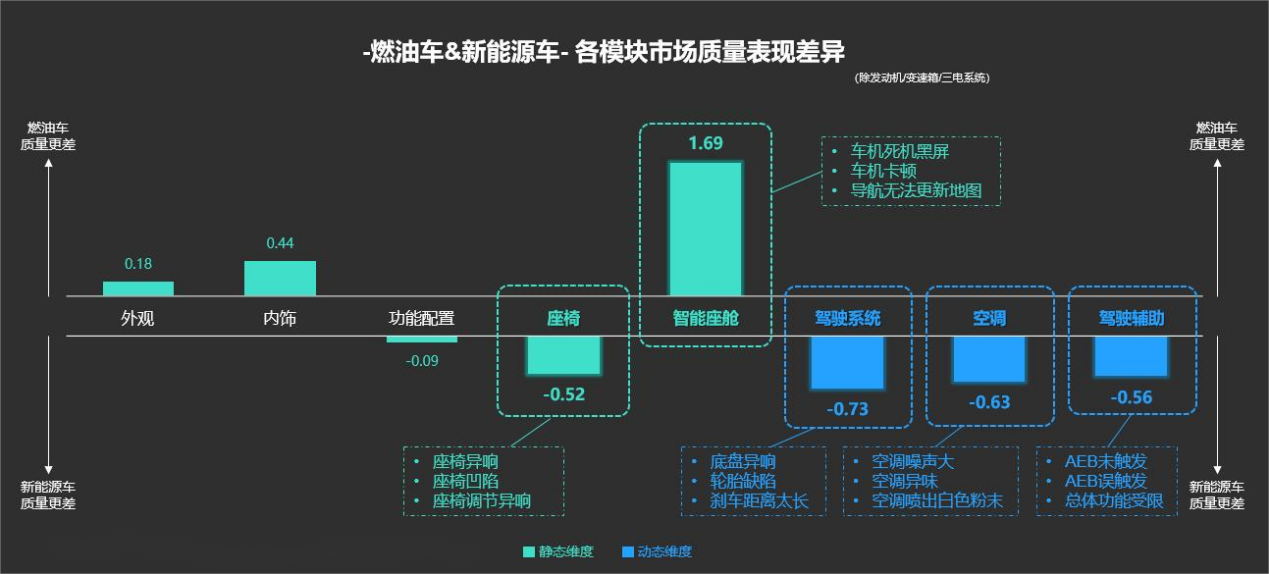 报告显示,燃油车和新能源车的市场质量表现均有所下降。燃油车在外观、内饰和智能座舱模块质量表现不及新能源车,其中智能座舱模块的差距最为明显,新能源车则在座椅、驾驶系统、空调和驾驶辅助模块的质量表现不及燃油车,尤其是驾驶系统和空调模块。