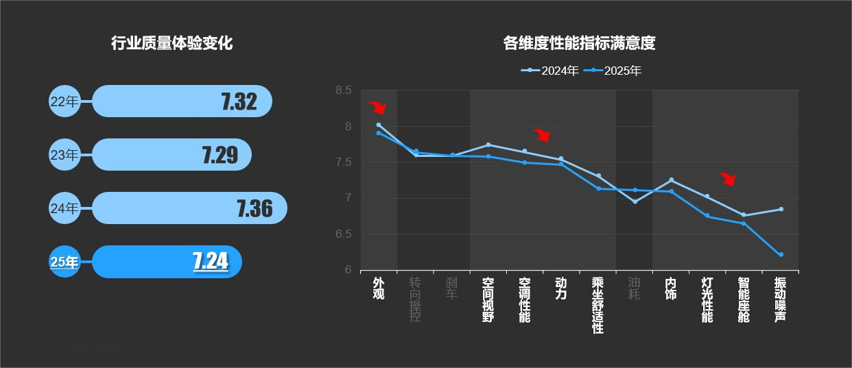 随着质量问题数呈波动态势,用户抱怨度持续提升,用户对产品体验的满意度也呈现波动下降态势。行驶时车内静音效果、储物空间和后排空间,成为性能满意度下降最显著的三个指标。