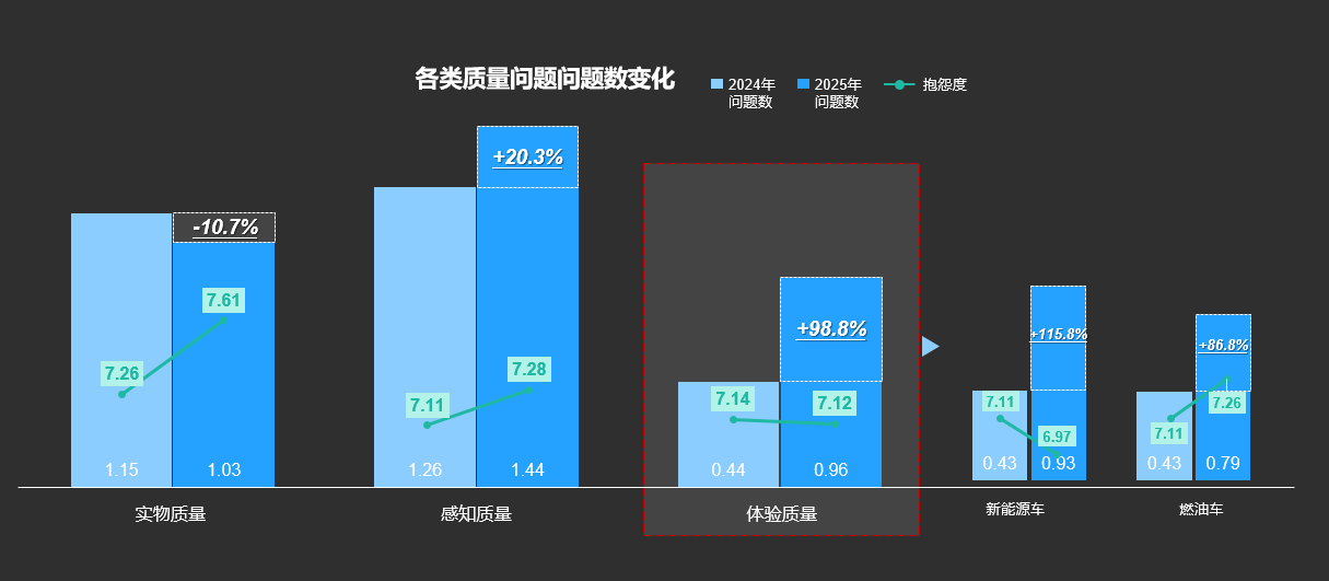 基于上述分析,本年度研究首次引入“体验质量”概念,将现有质量问题重新划分为实物质量(存在即功能失效);感知质量(存在即感受不好);以及体验质量(存在但体验因人而异)。研究发现,相比2024年,2025年实物质量问题数下降,而感知质量问题数上升,体验质量问题数增幅显著,部分功能在性能上无法满足用户体验需求,主要集中于驾驶系统、智能座舱和外观模块。这种高增长态势在不同能源类型上均有体现。体验质量问题也成为整体产品质量问题中最难预判、聚焦和掌控的问题类型。