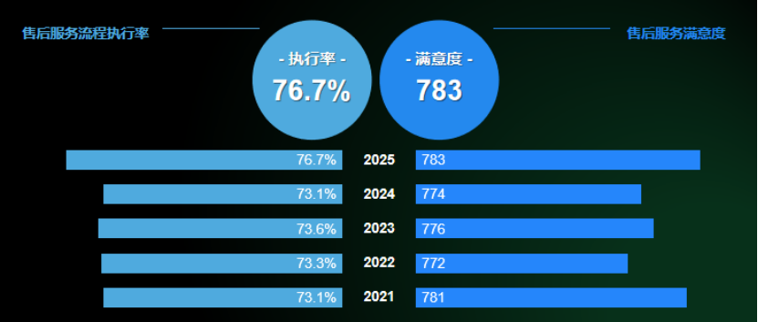 2025年12月18日,车质网与凯睿赛驰咨询联合发布《2025年中国乘用车售后服务满意度研究报告》,研究显示,2025年中国乘用车售后服务流程执行率提升至76.7%,售后服务满意度得分达到783分,均较2024年有所提升,行业整体服务水平呈现稳步上升态势。值得注意的是,“服务质量”在各维度满意度中仍处于最低水平,成为行业亟待突破的瓶颈。