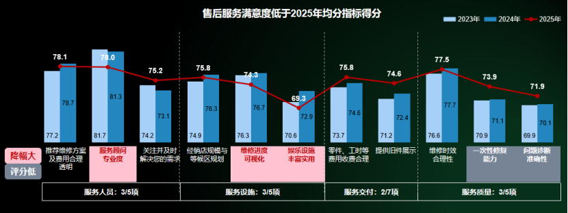 报告揭示,当前售后服务行业面临的核心挑战在于:基础服务流程已成行业标配,无法满足用户差异化需求,“做到”与“做好”(即基础落地与体验升级)之间存在明显差距。尽管“服务沟通”满意度有所提升,但“服务顾问专业度”指标下滑,表明专业能力建设仍需加强;“娱乐设施丰富实用”满意度持续走低,则反映出经销商在软性服务环节的精细化程度不足。这种“落地不扎实、精细化不足、理念与执行脱节”的现象,正是行业转型期的主要痛点。