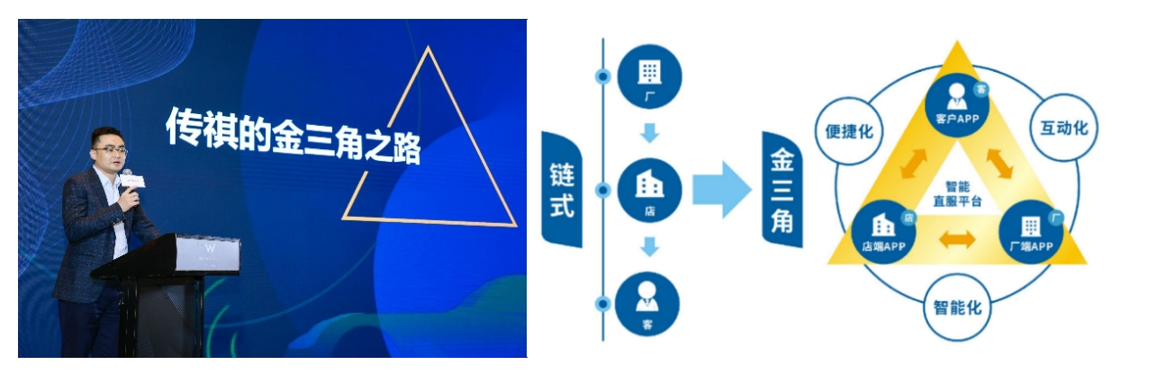 为满足新世代用户的需求,2019年广汽集团冯兴亚总经理提出“营销金三角”理论,同年,广汽传祺以售后服务为切入点推出广汽传祺APP,以数字化为核心,打造“客-店-厂”三位一体金三角价值生态圈,推动营销金三角的落地。
