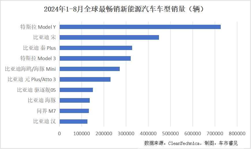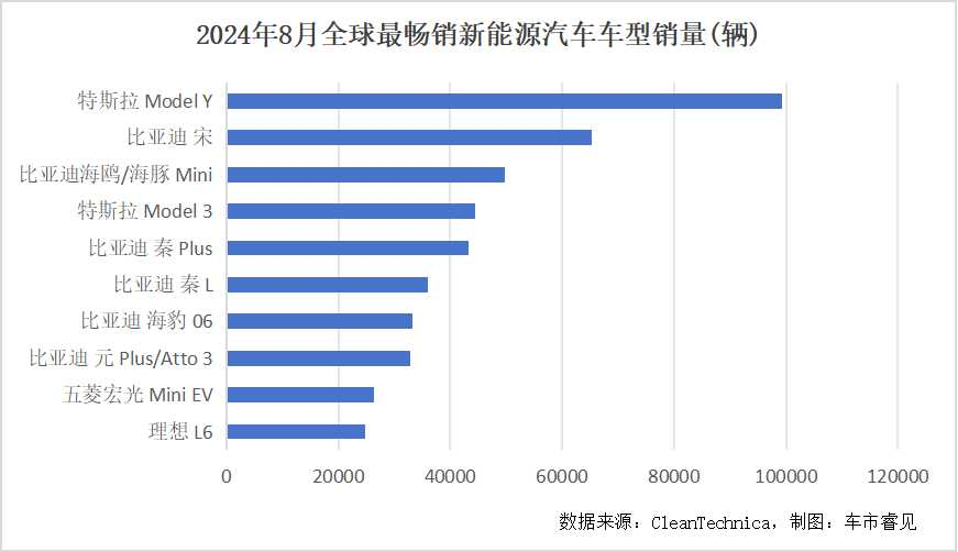 本月畅销榜单前20名中,比亚迪的车型产品占据11个位置。最大的亮点来自于比亚迪海鸥(Seagull/ Dolphin Mini),8月获得创纪录的49,714 辆销量,以“黑马”之姿荣登榜单第3名,作为比亚迪旗下小型电动车,因为目前在诸多出口市场的交付仍处于起步阶段,所以之后的表现值得期待。