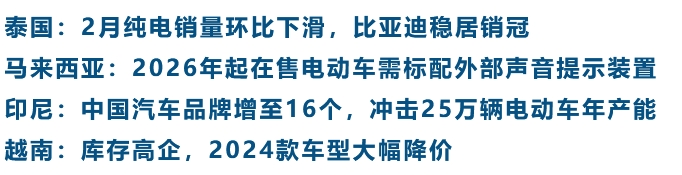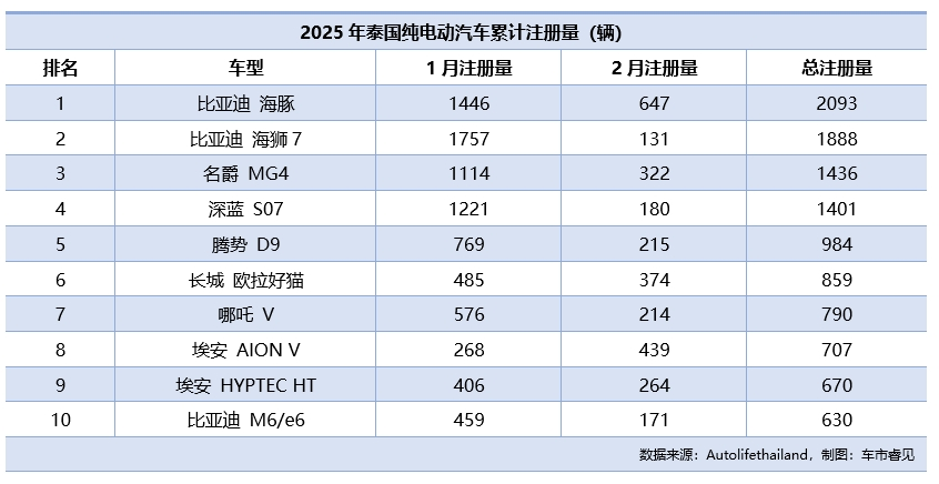 泰国:2月纯电销量环比下滑,比亚迪稳居销冠