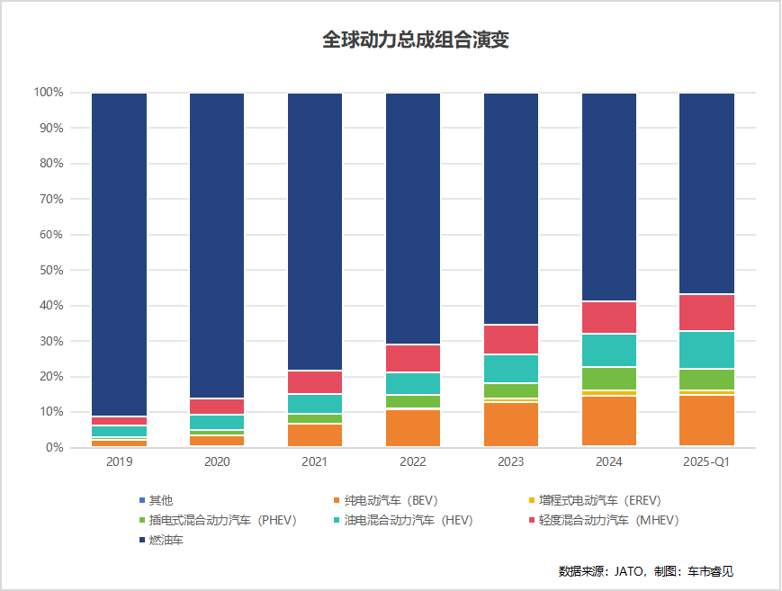 根据汽车行业数据与咨询服务提供商JATO Dynamics的研究,全球传统内燃机动力总成正持续被新型电气化技术取代,其市场份额自2019年以来已大幅下滑34.4个百分点。在各类新技术中,纯电动汽车已成为全球第二大主流动力总成,紧随其后的是非插电式混合动力(包括油电混动HEV及轻度混合动力MHEV),因其能缓解用户的续航焦虑并降低对充电设施的依赖,更易被市场接受。