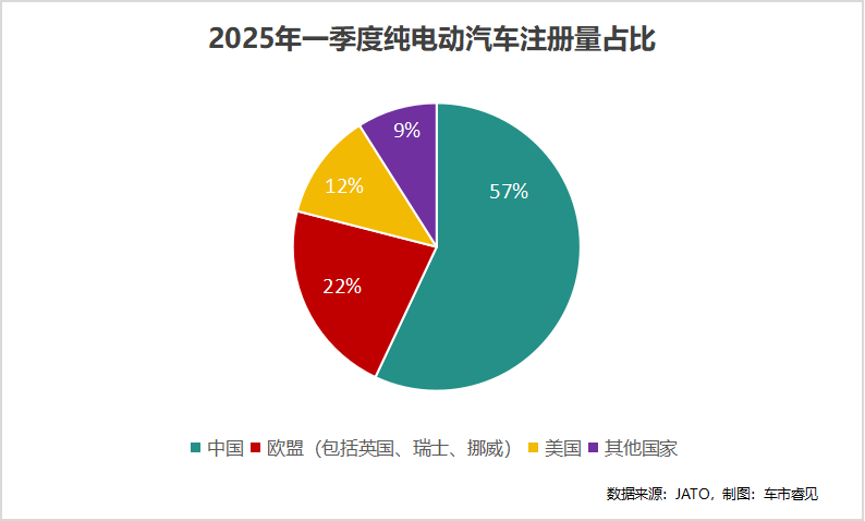 全球纯电动汽车注册量数据清晰揭示了各国发展的不平衡。一季度,中国贡献了全球57%的纯电动汽车注册量,占据绝对主导地位;其次是欧洲各国,占比22%,美国以12%的注册量占比位居第三,其他国家的电动汽车注册量还相对偏低,比如印度1.7%,韩国占比1.2%,土耳其1.1%,均不足2%。