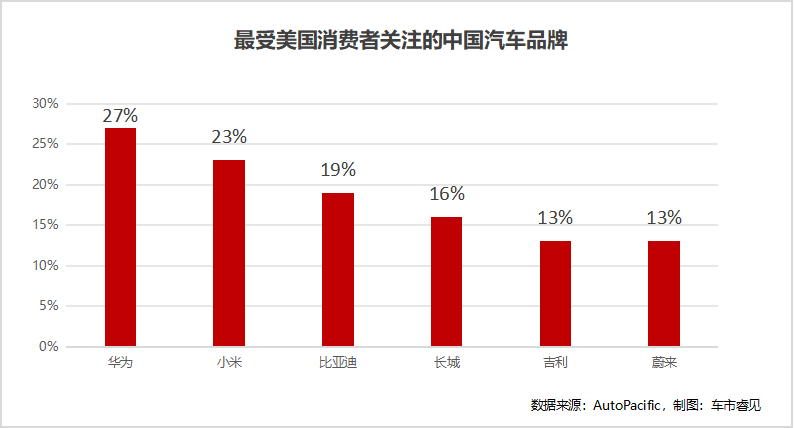 在众多品牌中,华为(27%)、小米(23%)与比亚迪(19%) 成为美国消费者认知度与考虑度最高的三大中国品牌。这一变化背后,是长期以来围绕中国品牌汽车的数据隐私与国家安全担忧正在缓和。消费者端的心理壁垒已开始松动,为中国品牌未来进入北美市场铺垫了潜在通路。