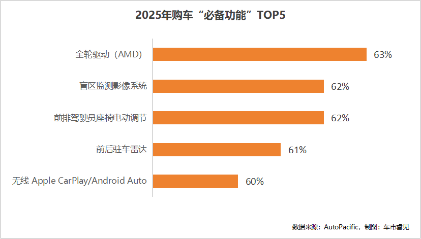 除了品牌认知的转变,美国消费者在车辆功能选择上也展现出明确的价值取向。AutoPacific同一项研究揭示了2025年最具决定性的购车因素:全轮驱动(all-wheel drive,AWD)。