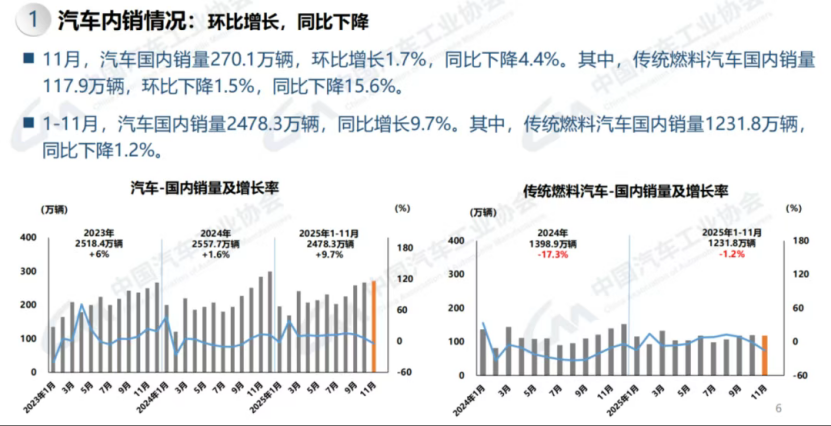 纵观2025年11月中国汽车产销量数据,可以称为行业转型期的缩影。从数据看,生产端的产能释放、出口市场的全球化布局、新能源汽车的渗透率突破,共同构成了中国汽车产业的核心竞争力,1-11月汽车产销超3100万辆、出口超630万辆,全年冲击历史新高、实现 “十四五” 圆满收官的目标已基本明确。