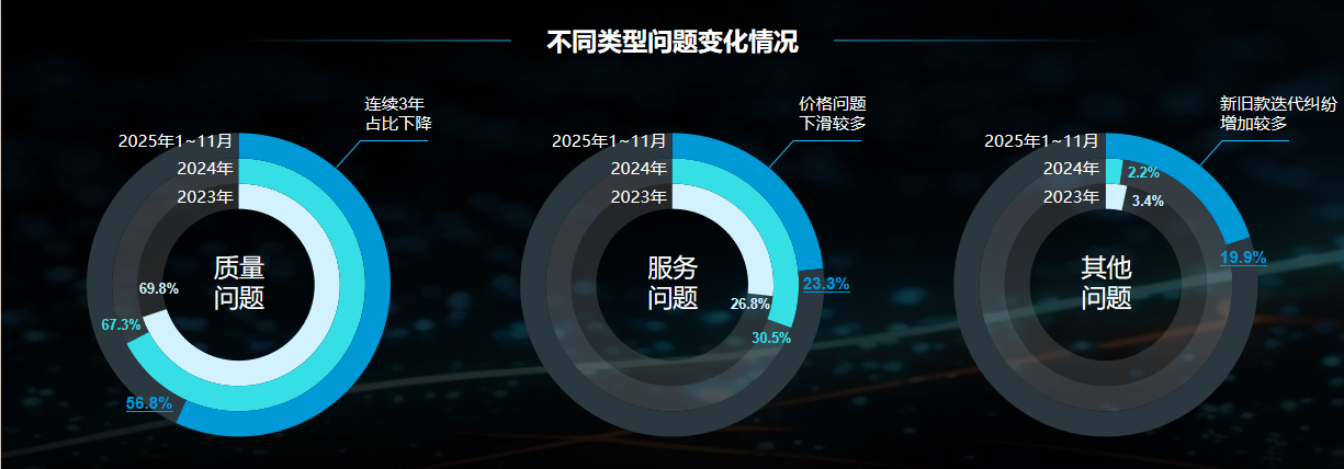 车质网数据显示,2025年用户投诉延续高速增长态势,1-11月投诉总量突破20万宗。从投诉结构看,质量问题占比持续下降,表明整车企业在产品质量控制方面取得了一定成效;服务问题中涉及价格的销售问题投诉明显减少,其他问题中因新旧款迭代引发的纠纷显著增加,成为新的投诉热点。