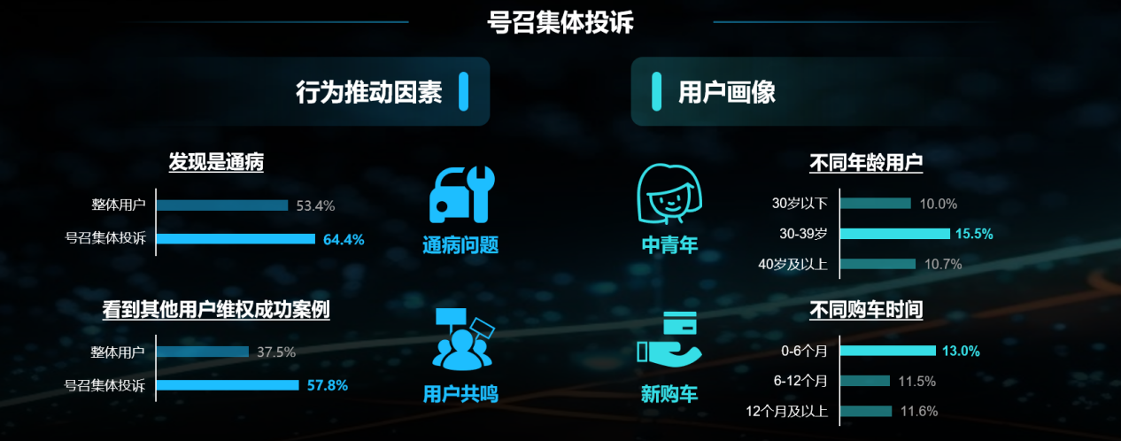 在信任缺失的背景下,更多用户会采取“向高层寻求解决”“集体维权”或“通过大V舆论施压”等方式,多维度施压以促使车企做出回应并推动问题解决。当用户遭遇承诺不兑现、服务态度及人员技术问题时,倾向于向更高层管理者反馈寻求解决;中青年用户(30-39岁)及新购车用户在遇到产品通病时,更易发起集体投诉;而产品安全隐患或官方敷衍则会促使用户转向舆论求助。
