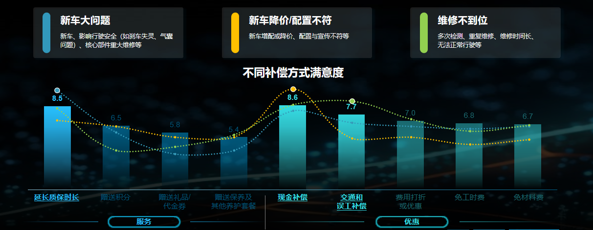 此外,不同投诉问题的用户对于补偿方式的需求和满意度也不同。例如,如果遇到新车严重问题,用户对延长质保时长的满意度最高;遇到新车降价或配置不符时,用户对现金补偿的满意度最高;遇到维修不到位问题时,用户对交通和误工补偿的满意度最高。这也意味着,车企在制定补偿方案时也应充分考虑用户需求,以提升用户回店率,形成正向闭环。